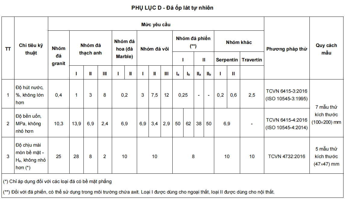 QCVN 16 quy định đá ốp lát tự nhiên cần đáp ứng các chỉ tiêu kỹ thuật sau: