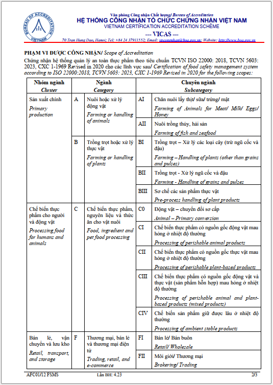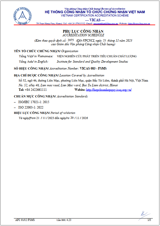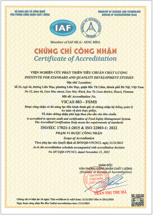 Từ ngày 21/11/2023 Viện Chất lượng ISSQ được công nhận theo Quyết định số 2075/QĐ-VPCNCL của BOA về việc công nhận tổ chức chứng nhận Hệ thống Quản lý An toàn Thực phẩm ISO 22000:2018 phù hợp theo tiêu chuẩn ISO/IEC 17021-1:2015 & ISO/IEC 22003-1:2022. Tổ chức Chứng nhận mang số hiệu: VICAS 083 - FSMS.