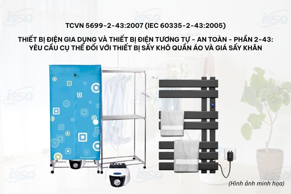 Tiêu chuẩn TCVN 5699-2-43:2007 quy định các yêu cầu an toàn đối với thiết bị sấy khô quần áo dùng điện để làm khô vật liệu dệt ở trên các giá đặt vào luồng không khí nóng và đối với giá sấy khăn bằng điện dùng trong gia đình và các mục đích tương tự, có điện áp định danh không quá 250 V.