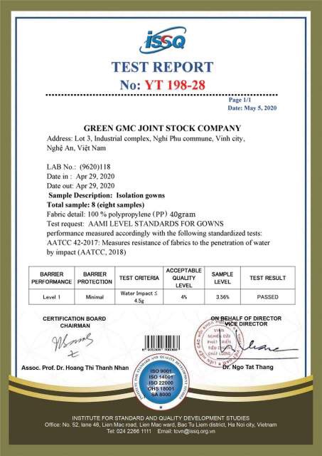 2.  Kết quả thử nghiệm và giấy chứng nhận lưu hành dưới đây không phải do Viện Chất lượng ISSQ phát hành.