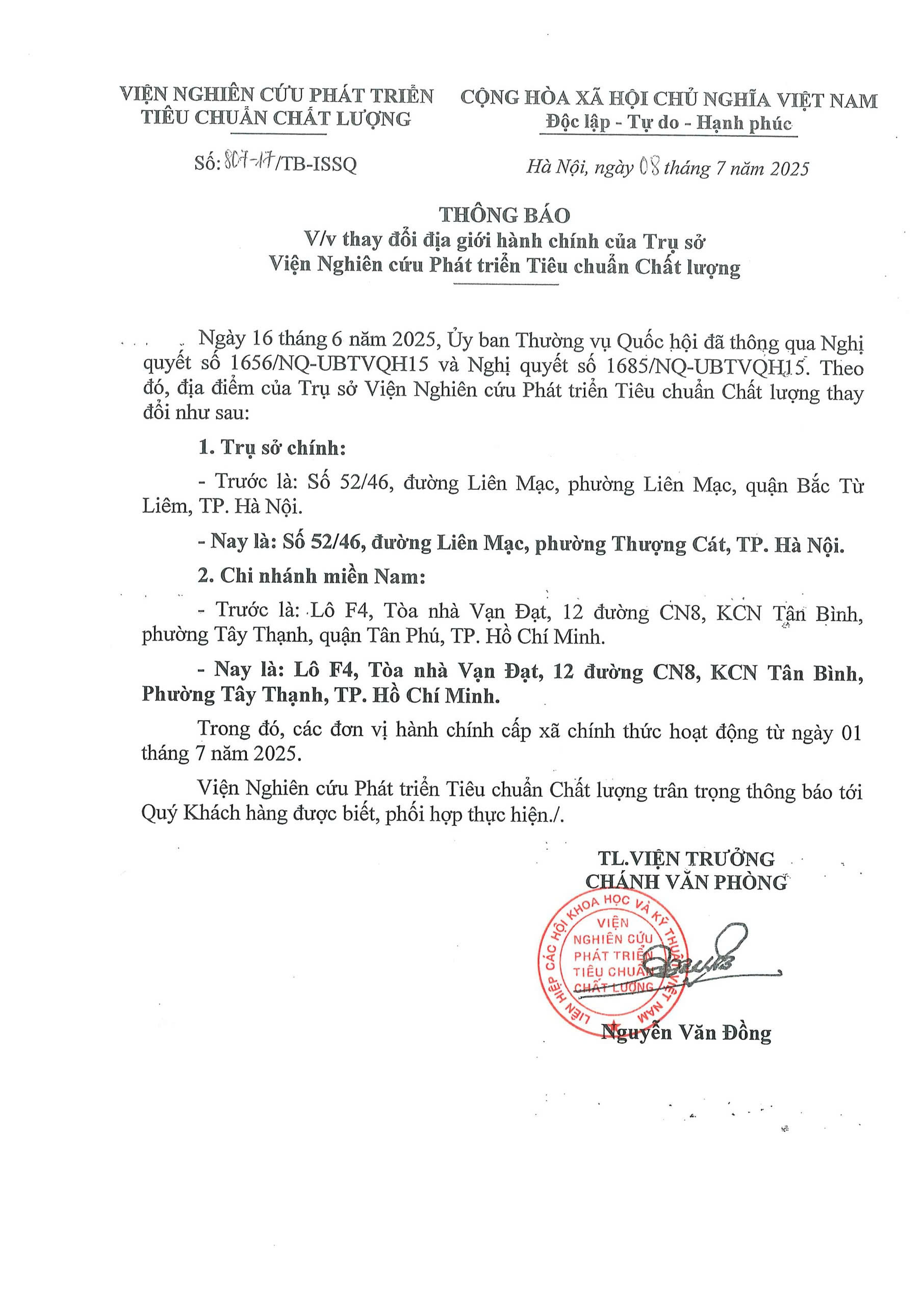 Viện Nghiên cứu Phát triển Tiêu chuẩn Chất lượng (Viện Chất lượng ISSQ) thông báo về việc thay đổi địa giới hành chính