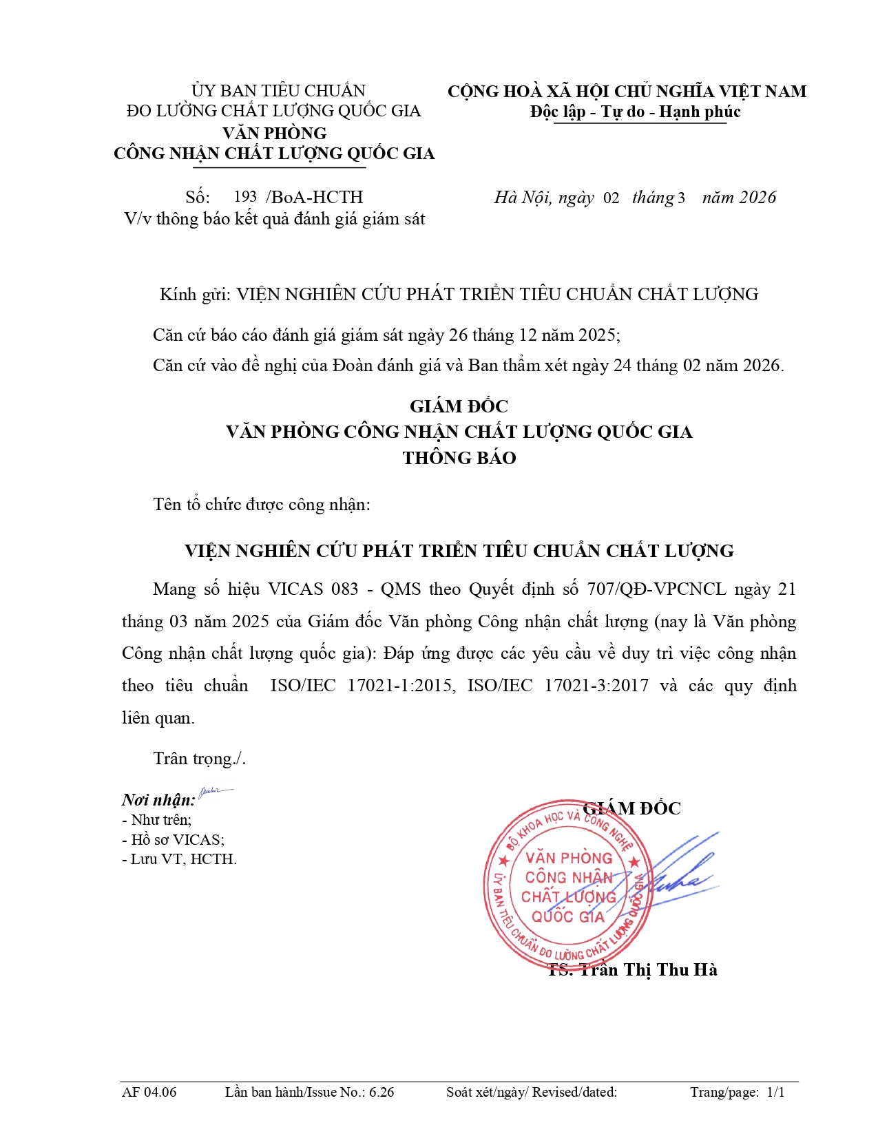 Từ ngày 02/03/2026 Viện Chất lượng ISSQ được công nhận theo thông báo duy trì số 193/BoA-HCTH của Giám đốc Văn phòng Công nhận chất lượng quốc gia (BoA) về việc công nhận tổ chức chứng nhận Hệ thống Quản lý chất lượng ISO 9001:2015 (dấu IAF) lần 3 (duy trì) phù hợp theo tiêu chuẩn ISO/IEC 17021-1:2015, ISO/IEC 17021-3:2017. Tổ chức Chứng nhận mang số hiệu: VICAS 083 - QMS.